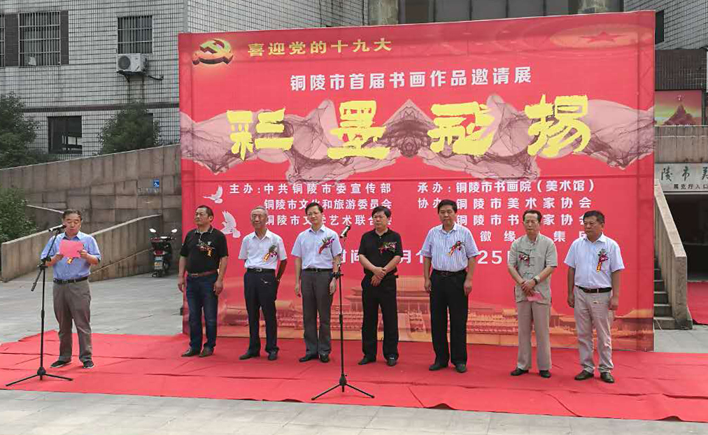 市书画院院长江冰首先致欢迎词,中共市委宣传部常务副部长李必胜宣布“彩墨飞扬”首届铜陵市书画展提名展开幕。