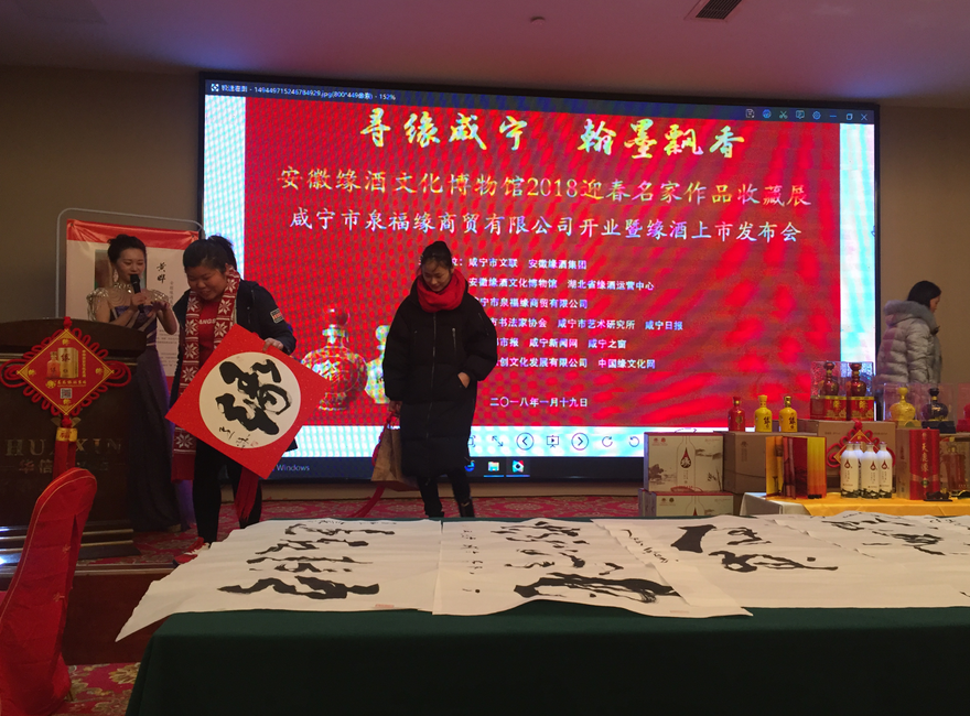 1月19日,由咸宁市文联、安徽缘酒集团主办,咸宁市书法家协会、安徽缘酒文化博物馆、湖北省缘酒运营中心、咸宁市泉福缘商贸有限公司承办,咸宁市艺术研究所、咸宁日报、铜陵缘创文化发展有限公司、中国缘文化网等协办的“寻缘咸宁 翰墨飘香——安徽缘酒文化博物馆2018迎春名家作品收藏展”暨湖北咸宁泉福缘商贸有限公司缘酒上市发布会在华信温泉大酒店隆重举行。