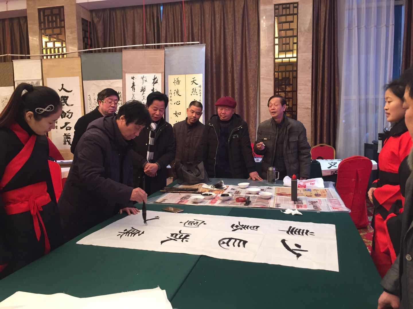 咸宁市文联副主席丁敬文,咸宁市书协主席卢方祥,金叶书画院名誉院长程新民,院长游爱民,原安庆市书协主席、安徽缘酒文化博馆名誉馆长余龙生,咸宁市青年书协副主席阮海清,安徽缘酒集团总经理王飞,咸宁市泉福缘商贸有限公司董事长谢文钦,安徽缘酒集团品牌顾问李建红,安徽缘酒集团湖北大区经理章有青以及咸宁市书法界有关领导、缘酒终端客户200余人参加。现场定货经典尊藏、尊藏系列缘酒2000余件。