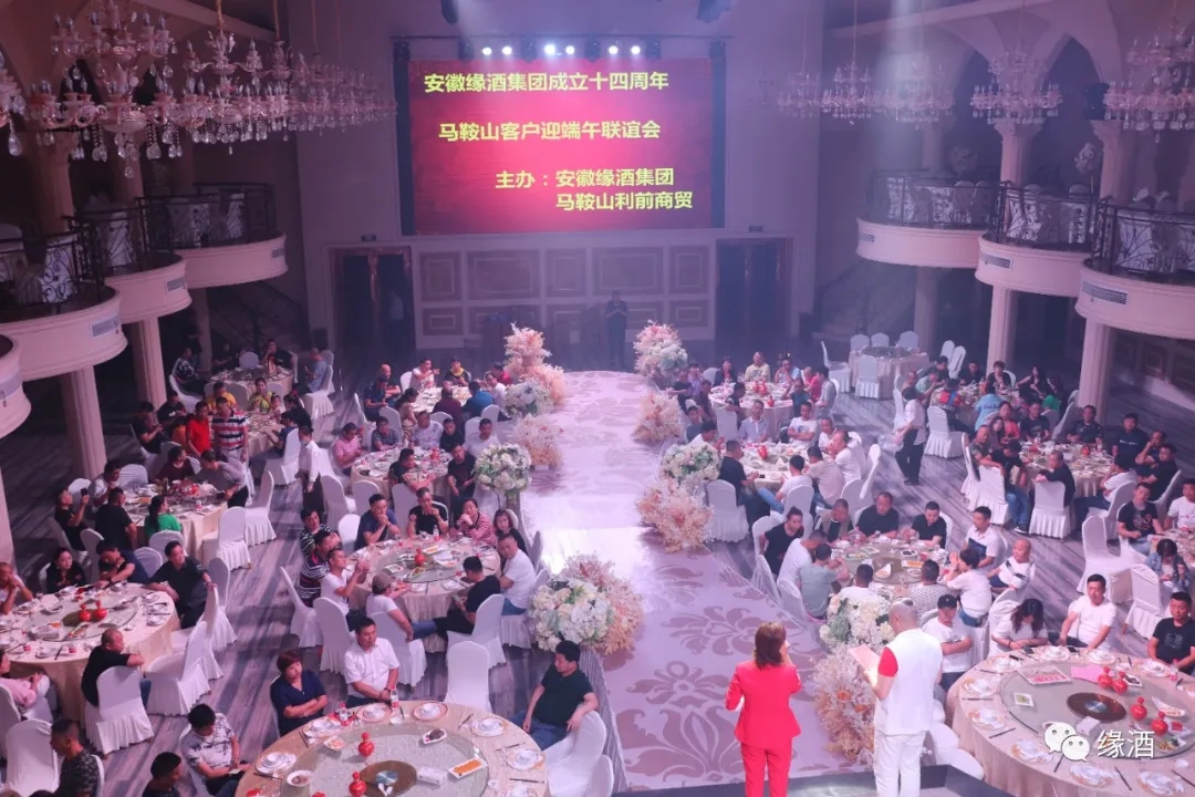 为庆祝安徽缘酒集团成立十四周年迎接端午佳节到来,6月23日,由安徽缘酒集团和马鞍山利前商贸联合主办的安徽缘酒集团成立十四周年马鞍山客户端午节联谊会在香树情缘大酒店隆重举行。集团董事长助理钱颖,铜陵缘源贸易有限公司负责人、皖南大区经理何基保,缘酒马鞍山利前商贸总经理张利前以及广大终端客户和高端消费者200多人参加此活动。联谊会由著名影视演员三毛、娜娜主持。