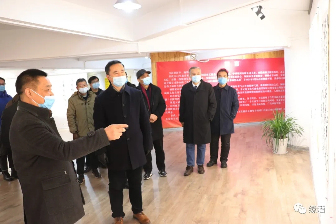 书画贺新岁,翰墨弥沉香。值此2021年新春来临之际,由铜陵市文旅委、铜陵市文联、中国缘酒有限公司主办,安徽缘酒文化博物馆、北京诗酒缘文化艺术院、安徽一线缘贸易有限公司承办,安徽缘酒集团、铜陵市书法家协会、铜陵市美术家协会、铜陵市书画院、安徽宁静斋文化发展有限公司协办的“共举杯 中国缘——2021迎新春全国名家书画作品展”于2021年1月16日在铜陵市美术馆开展。 铜陵市委宣传部常务副部长张文林,铜陵市文联主席张进,铜陵市书画院书记储立新,铜陵市委宣传部文艺科科长吴自力,铜陵市书法家协会主席姚时进,铜陵市美协秘书长于见见,安徽缘酒文化博物馆馆长黄晔等领导和嘉宾观展。