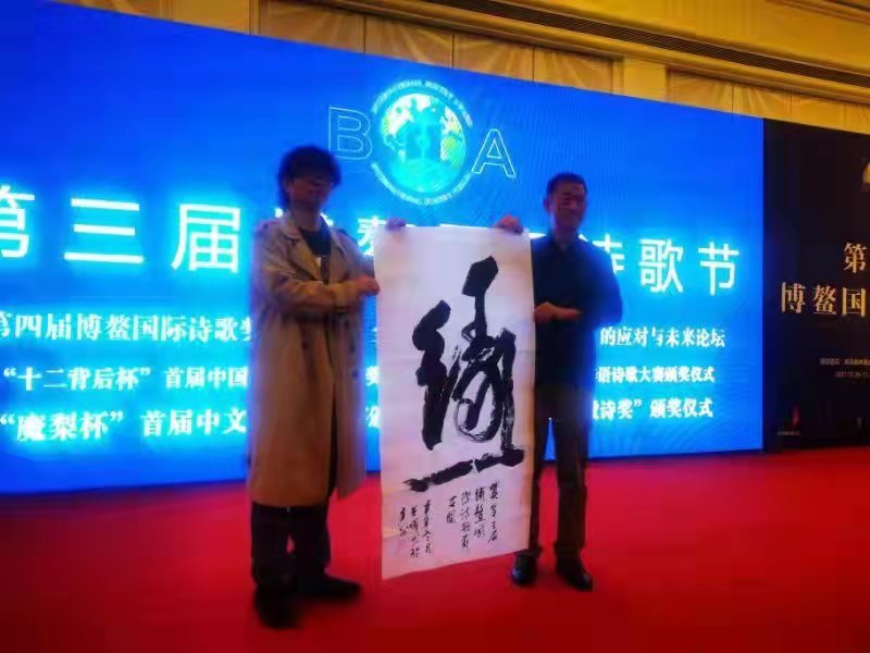 诗人黄晔先生祝贺第三届博鳌国际诗歌节开幕,并赠送一幅榜书书法作品《缘》。开幕式上,举行了赠墨仪式,并展示了黄晔先生的书法作品,同时会议舞台大屏上,还展示了“中国缘酒”的相关内容。