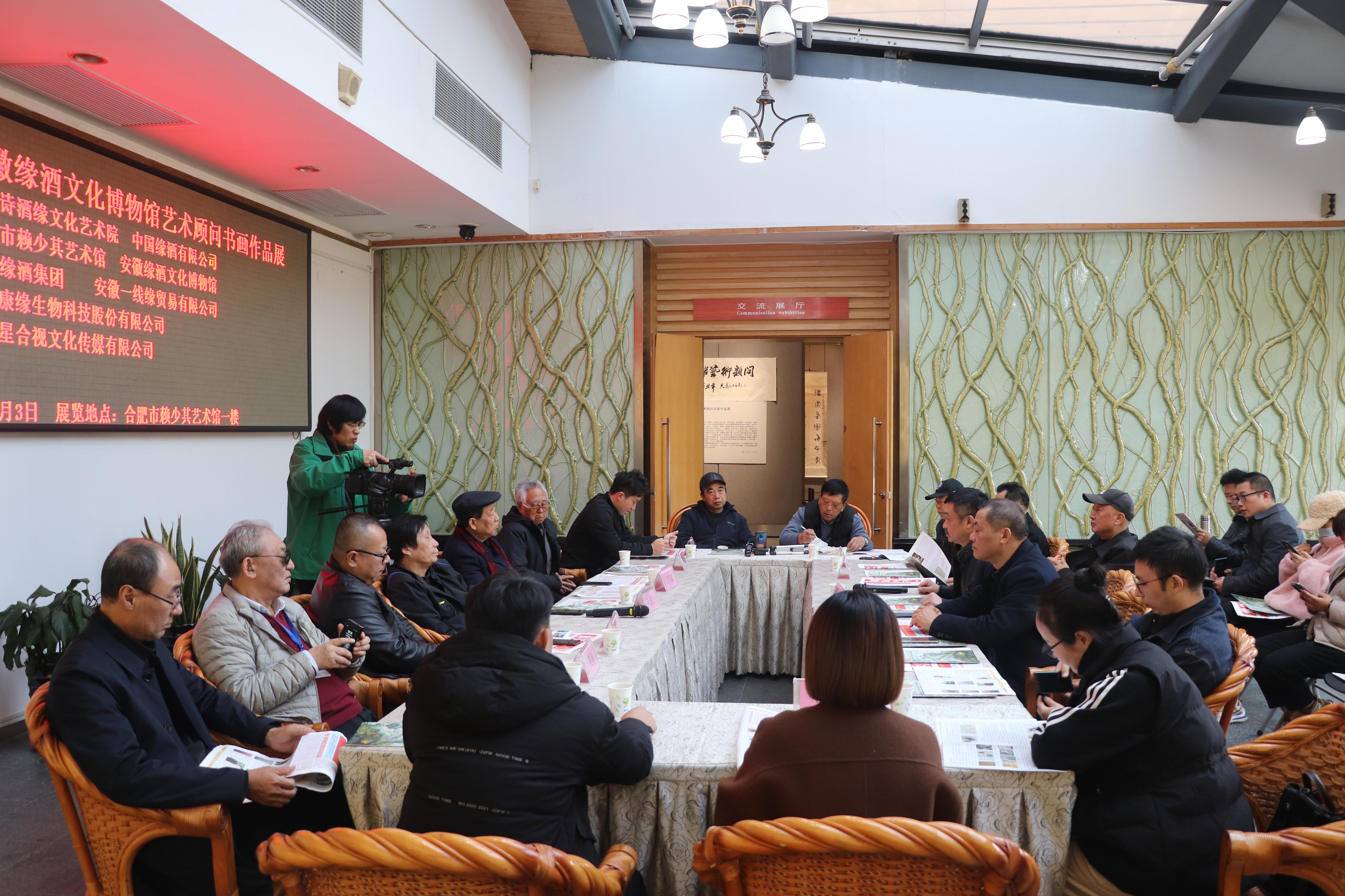 观展结束后,还在会议室开展座谈会,会上安徽缘酒文化博物馆馆长黄晔就缘酒品牌文化建设及本次艺术顾问书画展的办展状况向各位艺术家们做了介绍。余龙生先生在讲话中对本次展览概括为“规模不大,水平不低;少展咸集,风格各异。”唐根生、江冰、姚时进、杜鹏飞等艺术顾问和书画家艺术家们纷纷做交流发言。