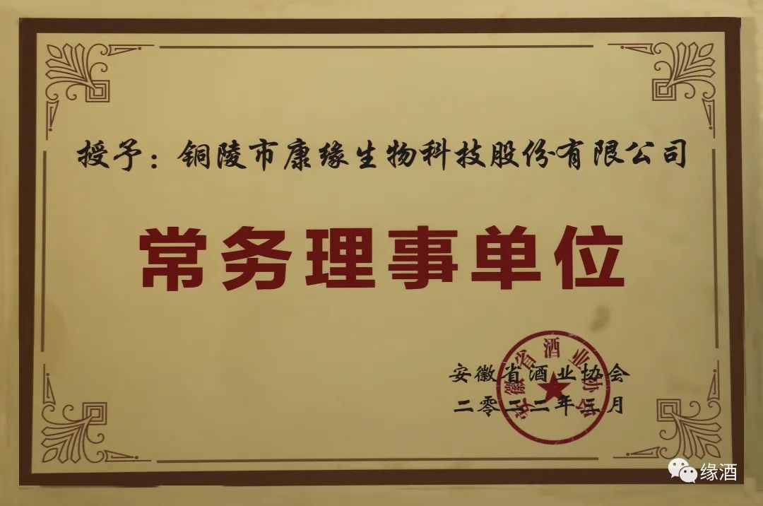 近日,经安徽省酒业协会第三届会员代表大会审议通过,吸纳铜陵市康缘生物科技股份有限公司为安徽省酒业协会常务理事单位,并颁发证书。