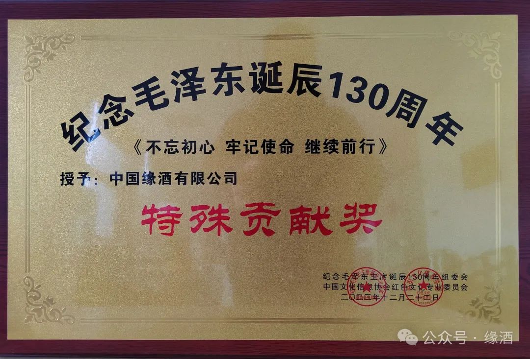 热烈祝贺中国缘酒有限公司在“纪念毛泽东诞辰130周年”荣获特殊贡献奖