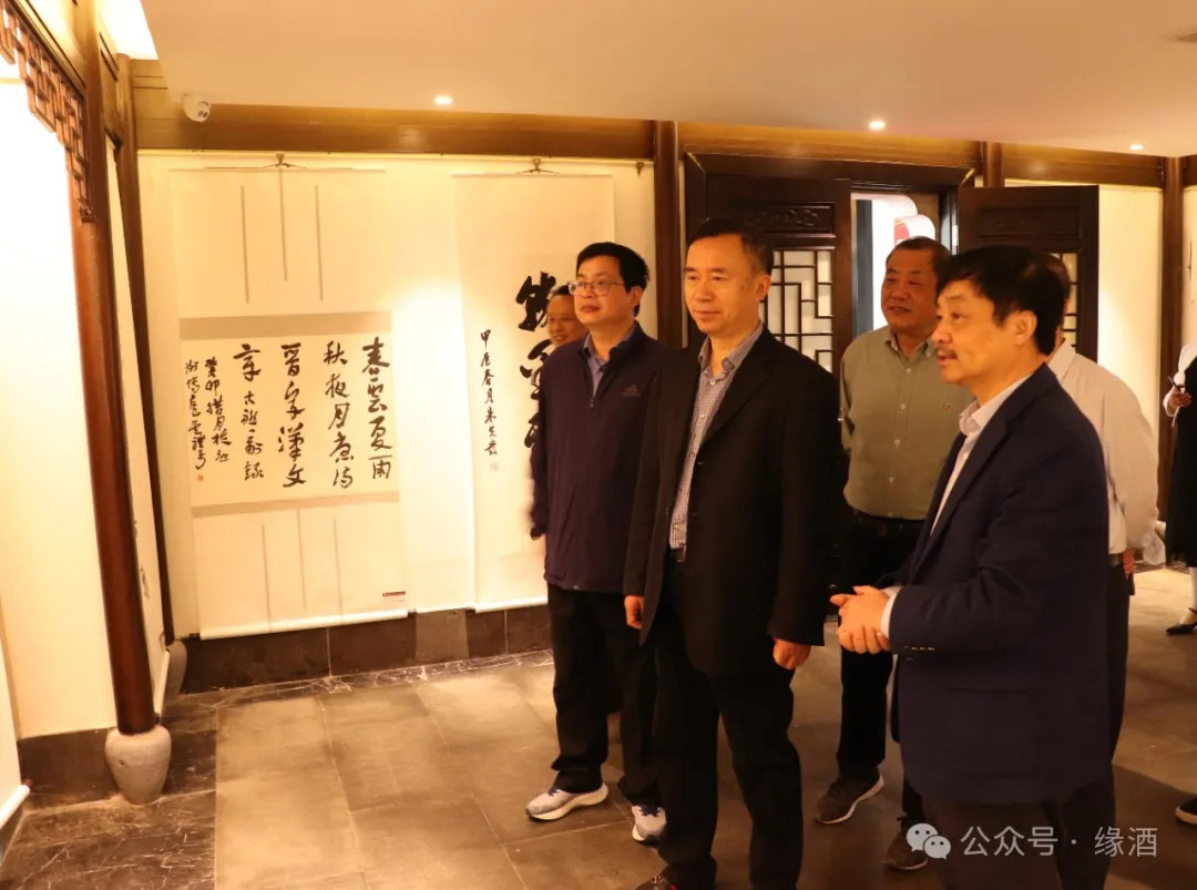 铜陵市人大常委、教科文卫主任张文林,铜陵市文联党组成员、专职副主席吴自力,铜陵市书画院院长储立新,铜陵市书画院副书记汪陵,铜陵市书画院原院长、北京诗酒缘文化艺术院副院长江冰,铜陵市书协主席姚时进,美协主席李定,中国缘酒有限公司营销总经理钱颖,安徽缘酒文化博物馆常务馆长彭东瑞,中国缘文化网总版主郑怡,北京诗酒缘文化艺术院秘书长程项,北京诗酒缘文化艺术院院长、安徽缘酒文化博物馆馆长黄晔等领导、嘉宾一齐参加观展仪式。