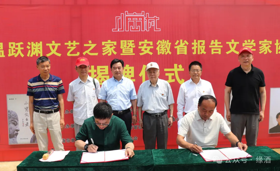 随后陈先发、李锦柱、刘景龙、杨屹、季宇等人共同为“温跃渊文艺之家”揭牌。揭牌仪式结束后,大家还一同参观了“温跃渊文艺之家”工作室。开幕式上,小岗村党委副书记严余山与安徽省报告文学家协会主席岑杰还签署了《安徽省报告文学家协会小岗村创作基地协议》书,随后还举行了揭牌仪式。